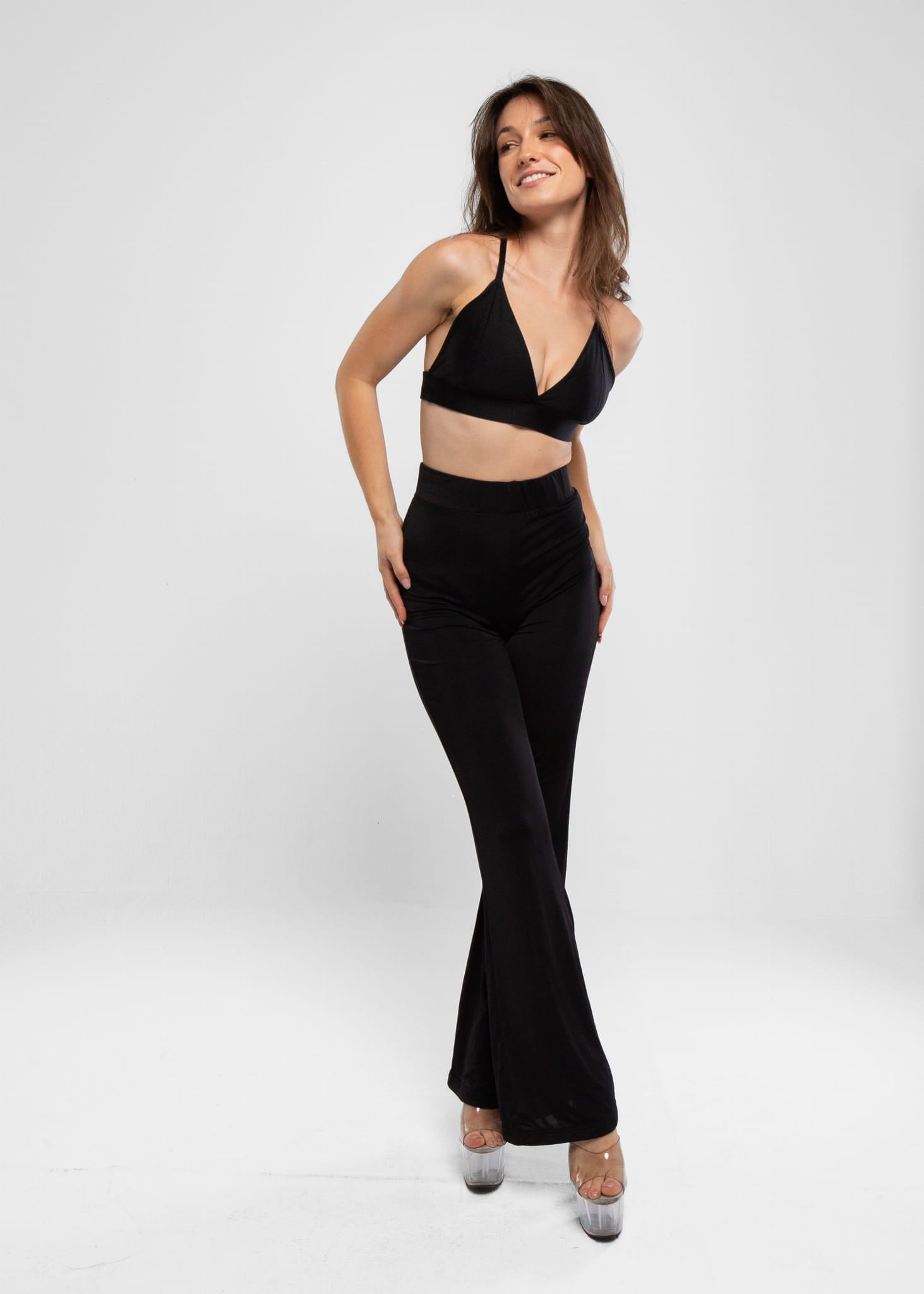 Thanks to the elastic waistband, these pants fit perfectly and stay in place even during the most dynamic movements. Made from a blend of polyester, viscose, and spandex, they provide not only the flexibility necessary for dancing but also all-day comfort. The Black Flare Pants are a must-have in your wardrobe.